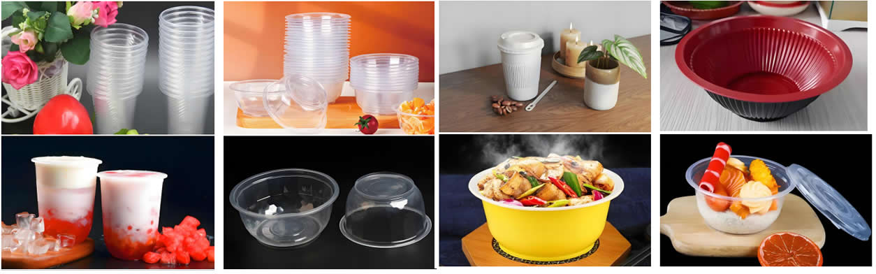 适用于处理不同的材料,如 A-PET、R-PET、C-PET、BOPS、HIPS、PP、PLA、PVC 和阻隔材料,适合生产各种饮料杯、咖啡杯、牛奶杯、水杯、碗、盒子等塑料制品。